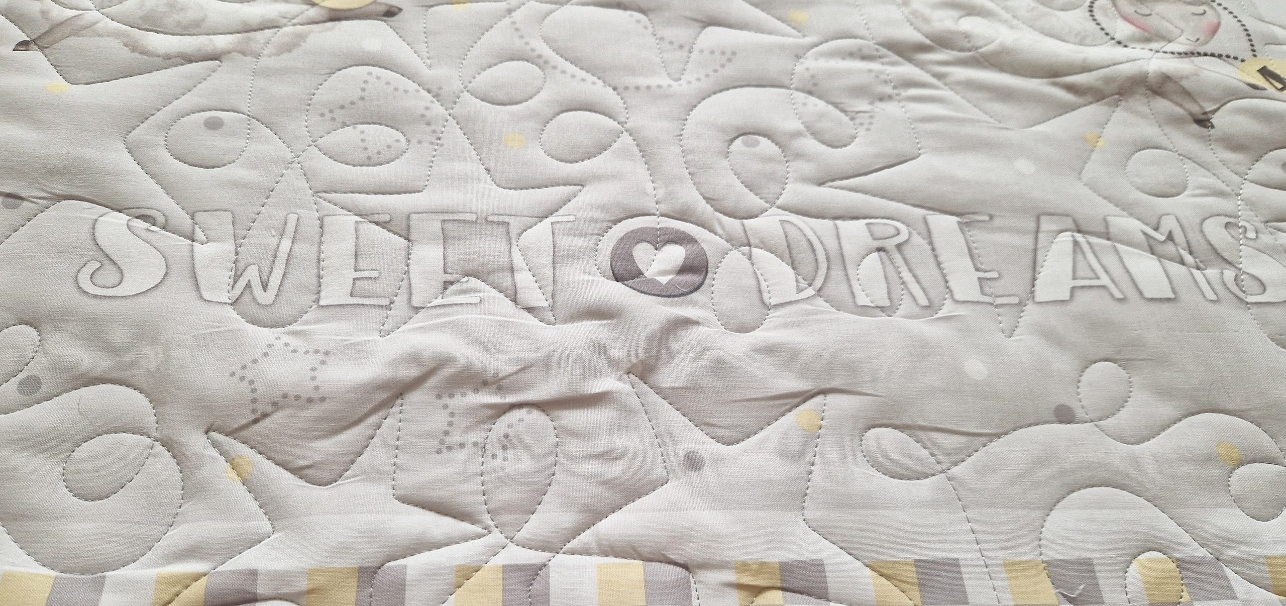We thought we were all out of these delightful Sweet Dreams baby quilts so we are almost sure this is the very last one! Measuring a nice size 34inches x 43inches. Backed in a complimentary grey backing and grey binding. A great gift for a baby boy or girl. Personalised option available.